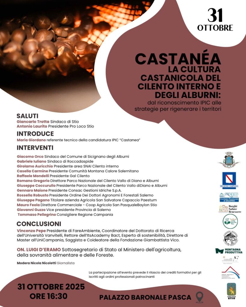 Ti invitiamo a partecipare il giorno 31 Ottobre 2025, a partire dalle 16.30 al convegno: Castanéa, la cultura castanicola del Cilento interno e degli Alburni, dal riconoscimento IPIC alle strategie per rigenerare i territori, che si terrà a Stio Cilento (SA) al Palazzo Baronale Pasca.